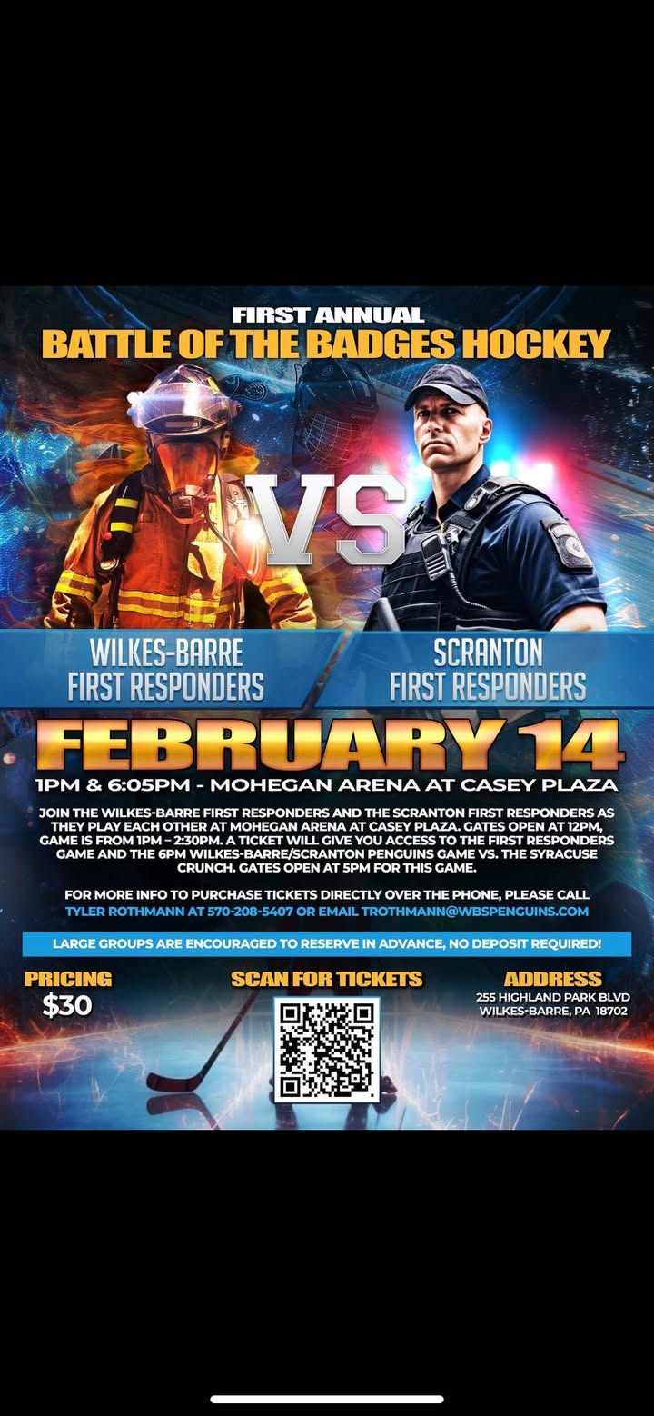 Wilkes-Barre first responders will face Scranton first responders in the first annual Battle of the Badges hockey event Feb. 14 at Mohegan Arena at Casey Plaza, featuring a 1 p.m. first responders game and a 6:05 p.m. Penguins vs. Crunch game, with $30 tickets that include admission to both games.